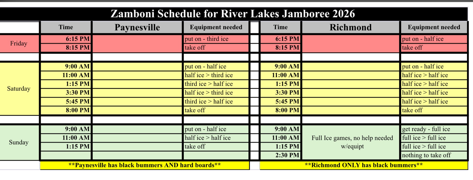 - In order to be able to zamboni the ice throughout the tournament, the black bumpers and temp boards/dividers will need to be cleared off the ice and then put back on for the games. We are asking River Lakes Team parents and Volunteer shift workers to help clear off and set back up the black bumpers and temp boards/dividers during zamboni sessions.